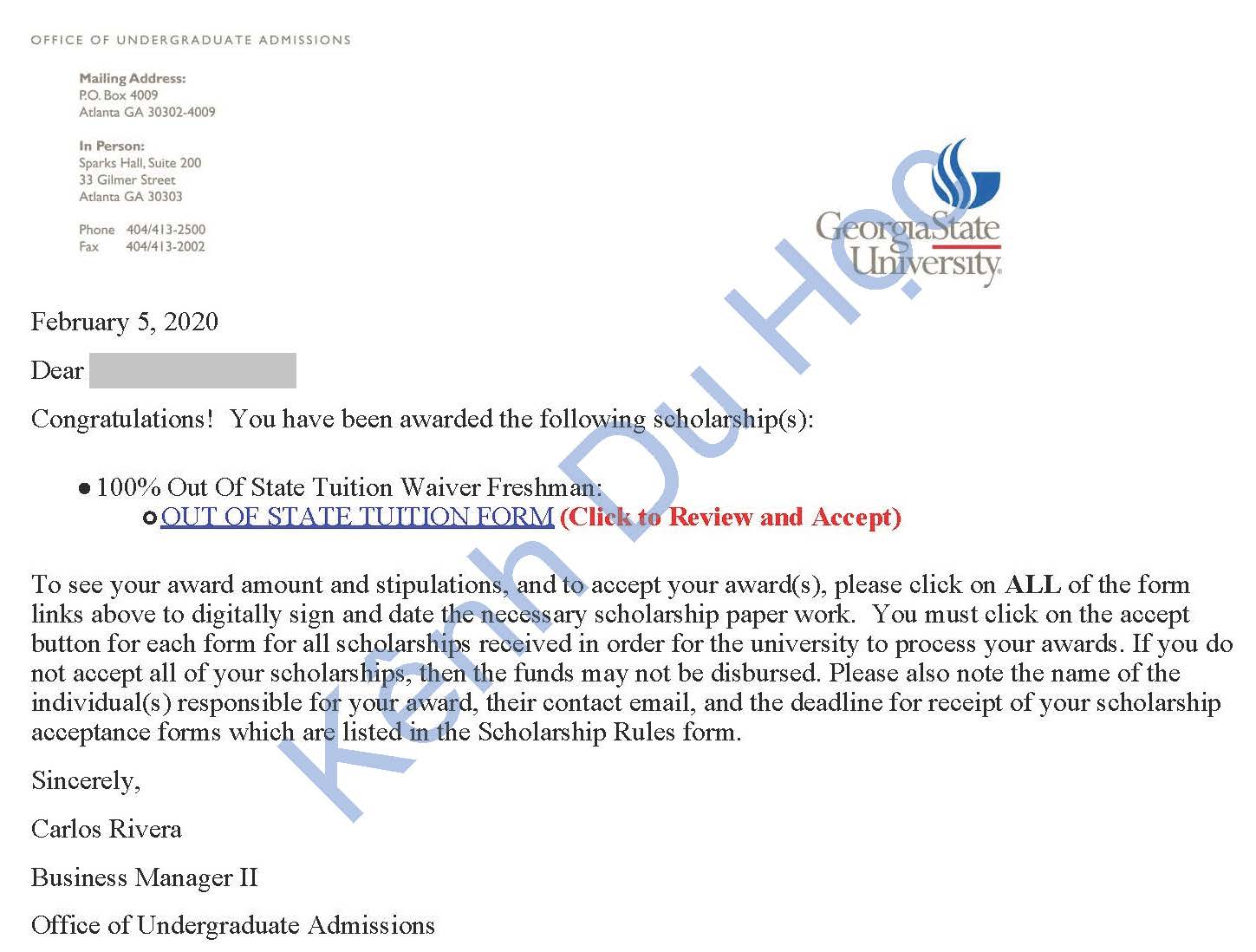 - Cơ hội học bổng "Miễn 100% học phí cho sinh viên quốc tế". Nếu được trao gói học bổng này, học sinh chỉ phải chi trả học phí bằng học phí của sinh viên bản địa (học phí của sinh viên Mỹ: $7,158/năm). Đây là học bổng danh dự và có số lượng hạn chế do trường Georgia State University cấp cho sinh viên quốc tế.